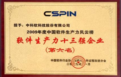 為表揚2009年度為軟件行業(yè)生產(chǎn)力提升做出卓越貢獻的單位和個人,中國軟件行業(yè)協(xié)會系統(tǒng)與軟件過程改進分會( CSSPIA)在2009年第八屆中國系統(tǒng)與軟件過程改進年會上,對“2009年中國軟件生產(chǎn)力風(fēng)云榜”獲獎單位和個人進行了表彰。中科軟科技股份有限公司榮獲“軟件生產(chǎn)力十三強企業(yè)”,左春總裁上臺領(lǐng)獎,并 就“ 危·機——聚焦中國軟件服務(wù)化時代的生產(chǎn)力”這一主題,同神州數(shù)碼、SOFT TECH、西門子、上海微創(chuàng)等企業(yè)領(lǐng)導(dǎo)共同進行高端對話,就公司在提升軟件生產(chǎn)力方面采取的有效舉措交換了寶貴的意見。